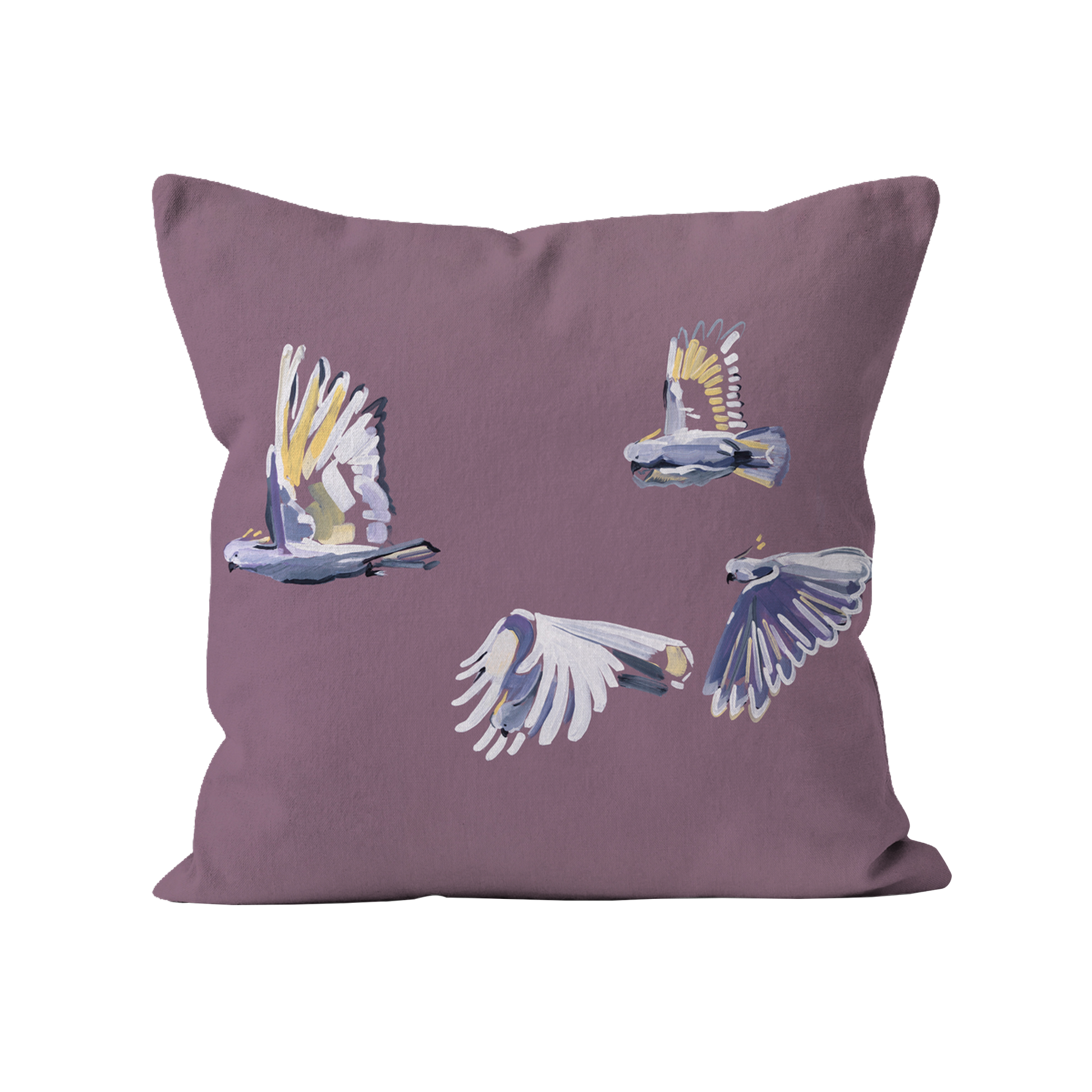 This cushion showcases a graceful series of hand-painted cockatoos in flight, captured in soft, expressive brushstrokes against a rich, muted background. Elegant yet uplifting, it’s perfect for adding character to a living room, bedroom, or reading nook, bringing a sense of movement, calm, and connection to nature into your home.