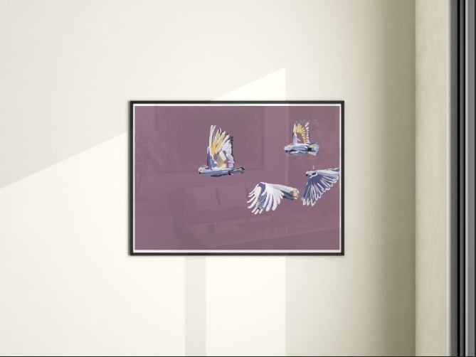 I got inspiration for this painting from a flock of cockatoos that flew past me on a grey morning in the Yarra Valley. A storm was brewing and the air crackled with a vibrant energy. I painted them on a mauve background using a simple colour palette of grey, white, yellow and purple.