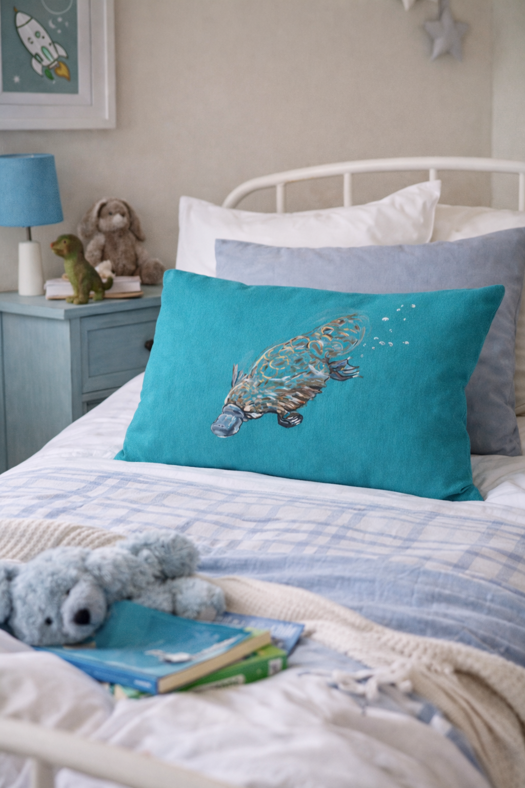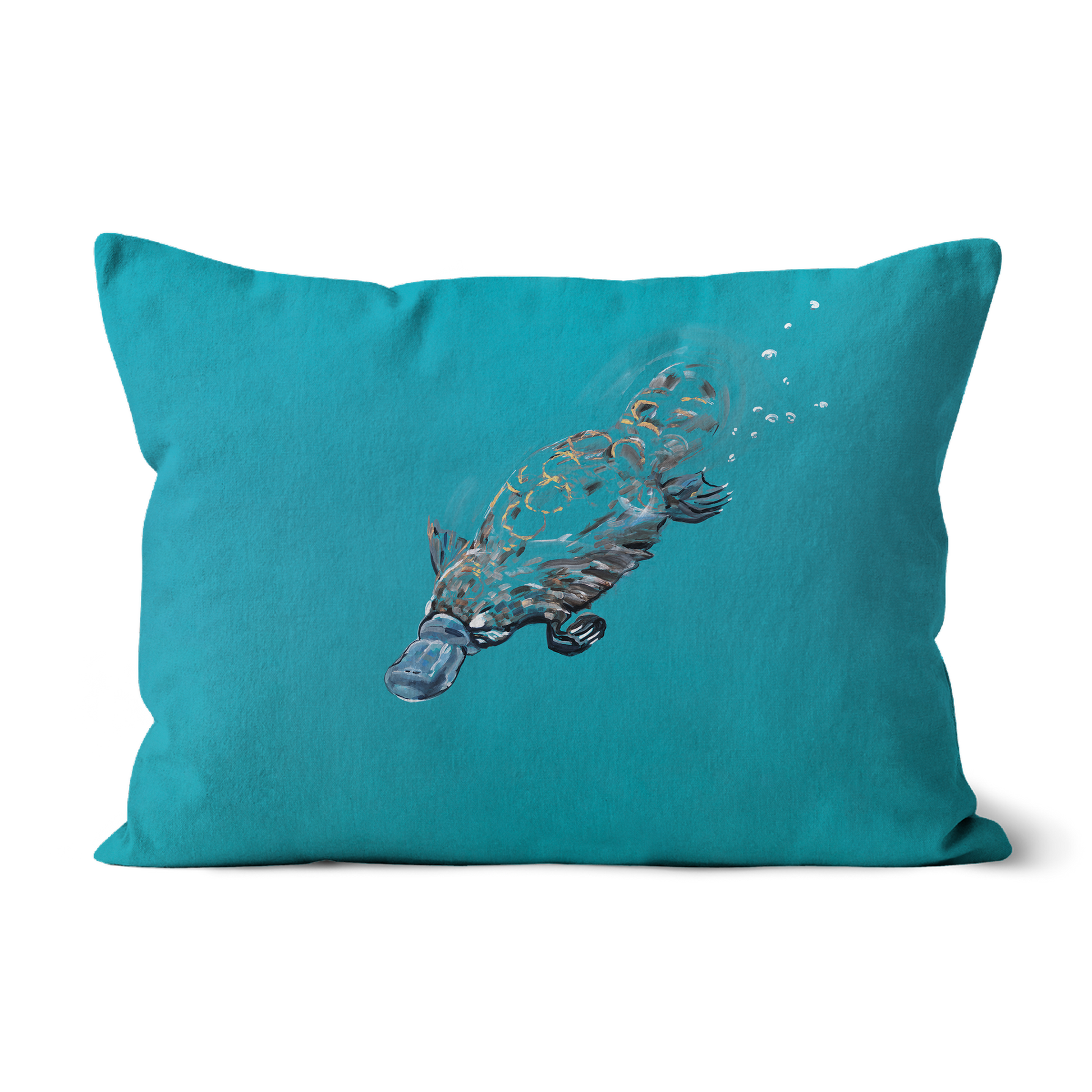 This cushion features a hand-painted platypus gliding through water, captured with fluid brushstrokes against a rich teal blue background. Unique and unmistakably Australian, it’s perfect for adding a sense of calm, curiosity, and character to a sofa, armchair, or relaxed living space inspired by nature.
